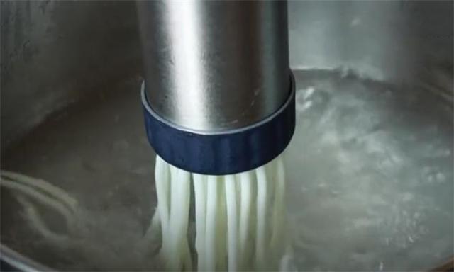 2.然后揪一部分下来,整理成长条状,放进面条机里面,锅里水烧开后,把土豆粉压到锅里面,没有面条机的,可以直接用擀面杖擀成手擀粉,也是不错的。