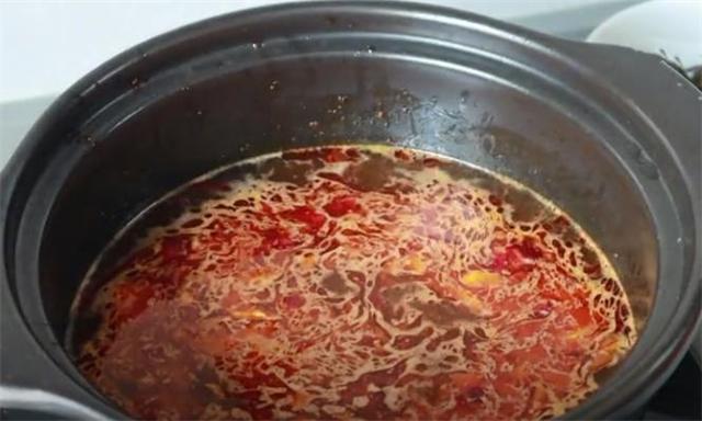 4.往砂锅里倒入少量的油,油热以后加入葱姜蒜和干辣椒段进去翻炒,再加入几小块的火锅底料进去翻炒,把火锅底料炒化开,炒出它们的香味、麻味和辣味,然后往锅里倒入多一些的开水进去,再加入生抽进去,加一勺白胡椒粉进去搅一搅。