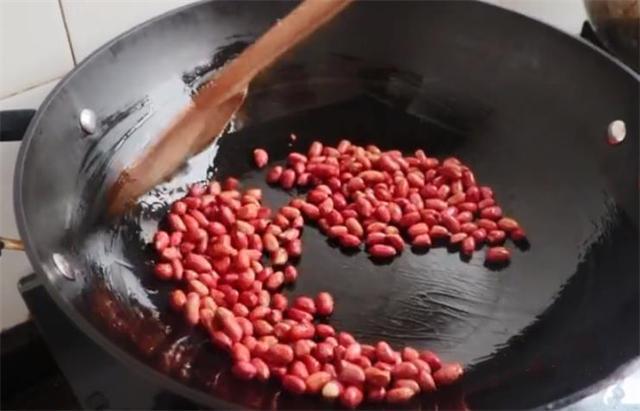 4.锅里倒入少量的油,把花生米倒进去炒熟,炒熟后捞出来备用。