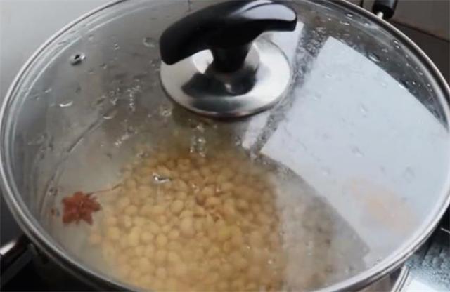 2.把黄豆倒锅里煮下,加入八角、两勺盐,盖上锅盖把黄豆煮熟。