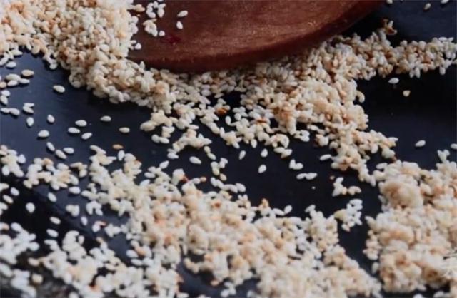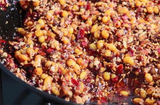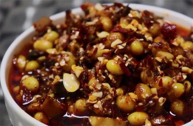 10.锅里加入葱姜末爆香,再加入切好的香菇丁炒香,然后加入黄豆翻炒,大约10分钟左右,再加入调好的料汁翻炒,加入豆豉,豆豉有提香的作用,翻炒两分钟后,加入碾碎的花生米,还有白芝麻,最后加入红辣椒面、盐、白糖,翻炒两分钟左右,搅拌均匀就可以出锅了。