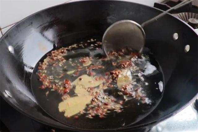 9准备点小茴香、花椒、八角、香叶,锅里倒入适量的油,做香菇酱,这个油可以多倒一点,油温五成热的时候倒入这些大料炒香,这里记得用小火,等大料完全炒出香味后捞出来。
