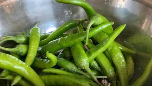 1.我今天买的是2斤小米辣,小米辣要选这种新鲜的,辅料是这种青色的杭椒,杭椒我买的是1斤,杭椒也要选这种新鲜的比较直的,小米辣和杭椒的比例是2:1。
