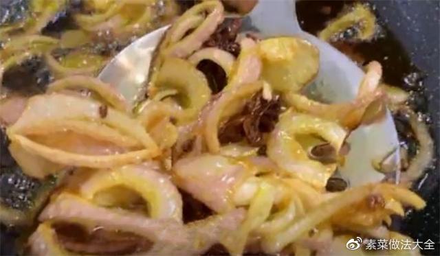 9.接下来我们来炼油,最好选择菜籽油,因为菜籽油的烟点比较高,适合煎和炸,其他的油在长期高温的情况下容易产生致癌物质,油温至五成热的时候把香料放进去炸,开小火慢慢的炸,一边炸要一边的搅拌,尽量把它炸的干一点,炸至所有的香料变得微微焦黄就可以了,然后把香料捞出来。