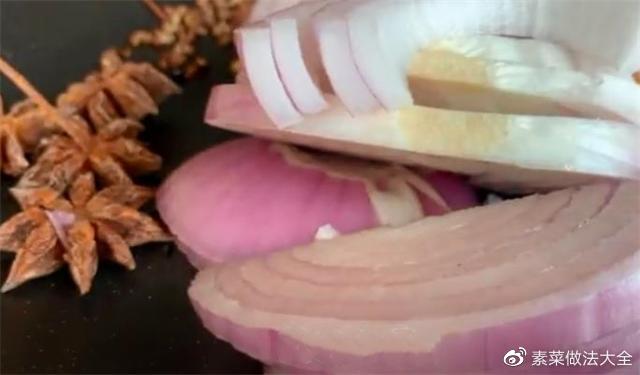 8.下面准备点配料,一个洋葱,2根桂皮,3片香叶,一小把花椒,4个八角,把洋葱切成片,放入碗中备用。