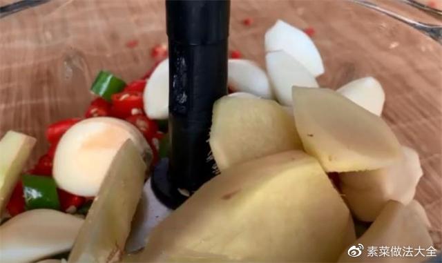 6.全部切好以后放进料理机里面,然后加入大蒜和生姜片,所有的辣椒大概要100g大蒜和100g生姜,然后将它们打成末。
