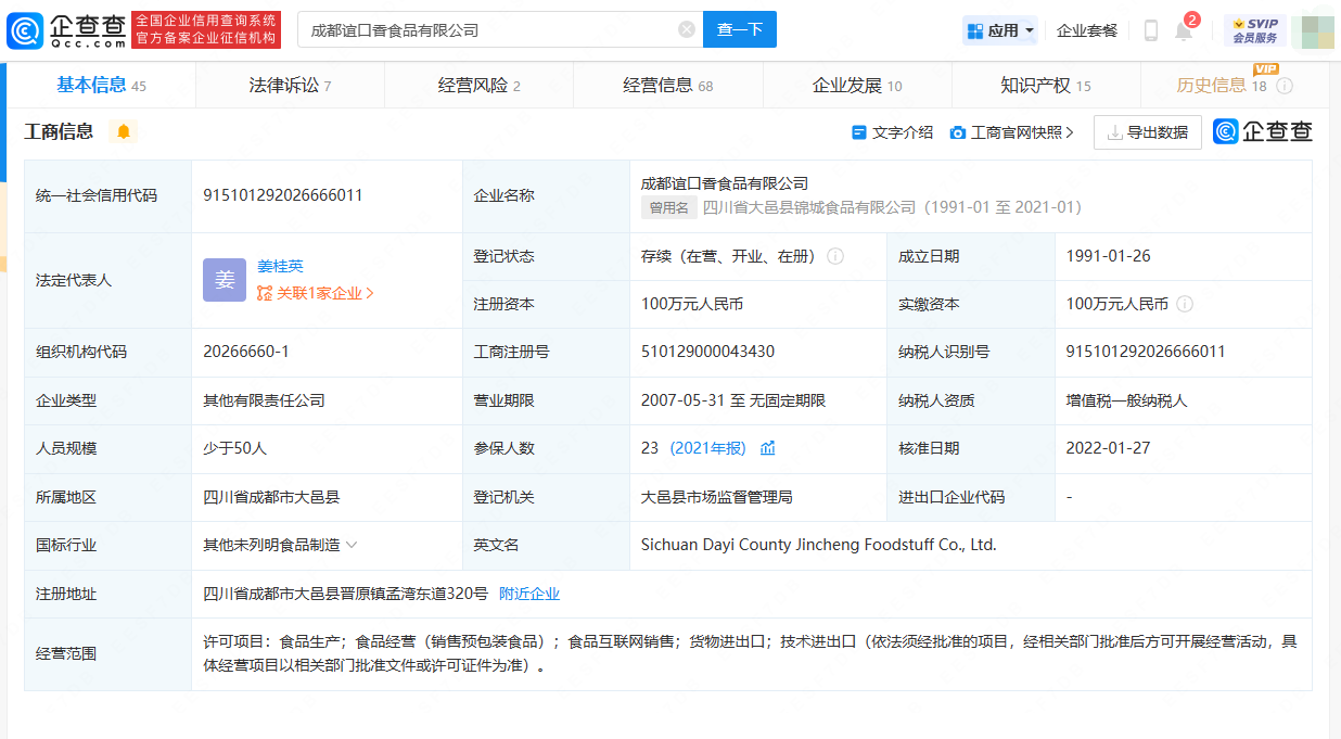据报道,密子君回应带货无骨凤爪中发现蟑螂,称蟑螂是自己红油碗中的,向观众和商家道歉,并且晒出了相关质检报告。企查查APP显示,检验报告委托方成都谊口香食品有限公司成立于1991年1月,法定代表人为姜桂英,注册资本100万人民币,近期该公司因“酸辣去骨筋”中脱氢乙酸项目不符合添加剂标准要求,即检验结果为案涉产品经复检检出脱氢乙酸及其钠盐项目0.596g/kg(标准指标:≤0.5g/kg)被市场监督管理局罚款5.1万元。