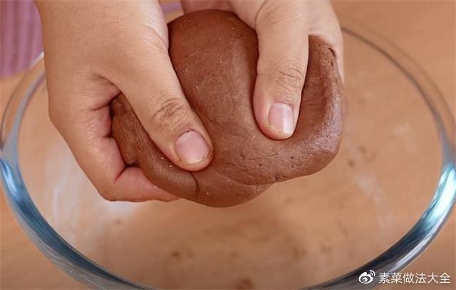 2.做这个饼干不需要过多的揉面,我们用虎口处掐出来一个小面剂,里面包上一些巧克力馅,这样可以形成一个爆浆的感觉。