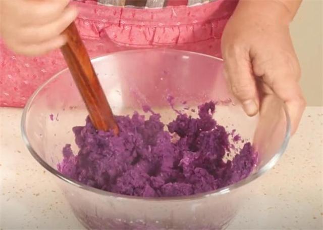 2.这会儿时间我们切点紫薯蒸熟,趁热捣成泥,再加点白糖,喜欢吃甜的可以多加点。