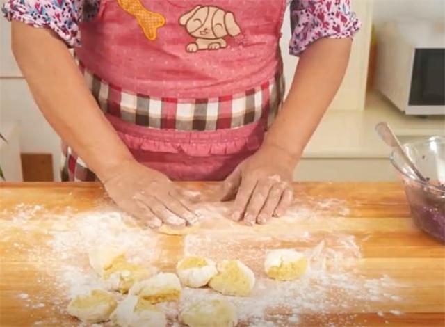 3.案板上撒些干面粉,现在我们把醒好的面拿出来,揉匀后分出一个个婴儿拳头大小的面剂子,稍微按扁一点包入紫薯。