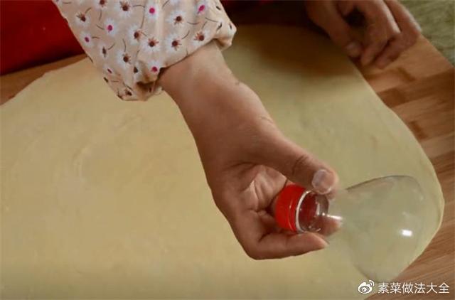 2.现在面团已经醒好了,取出放在案板上再揉均匀、揉光滑,然后用擀面杖擀成一张薄饼,再用我们自制的模具切成圆形的小面饼。
