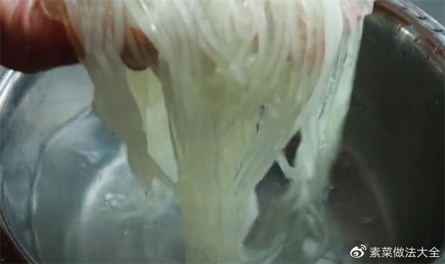 3.煮大约2分钟就可以了,然后把煮好的土豆粉控水捞入凉水盆里,给大家看一下,做好的土豆粉透明劲道爽滑,用两手使劲抻,也不会断,接下来给大家分享一个简易版的砂锅土豆粉做法。