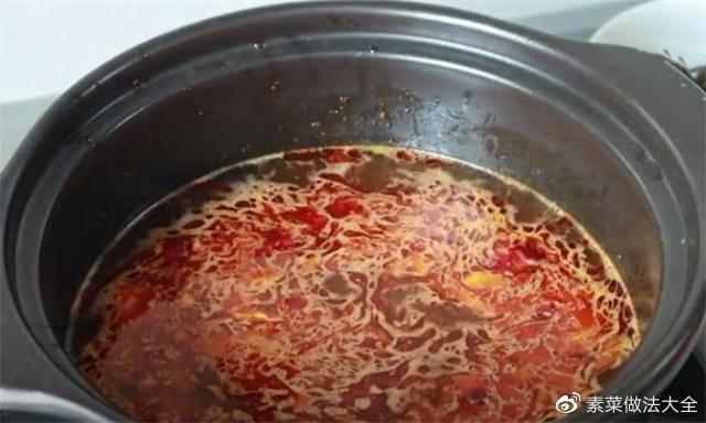 4.往砂锅里倒入少量的油,油热以后加入葱姜蒜和干辣椒段进去翻炒,再加入几小块的火锅底料进去翻炒,把火锅底料炒化开,炒出它们的香味、麻味和辣味,然后往锅里倒入多一些的开水进去,再加入生抽进去,加一勺白胡椒粉进去搅一搅。