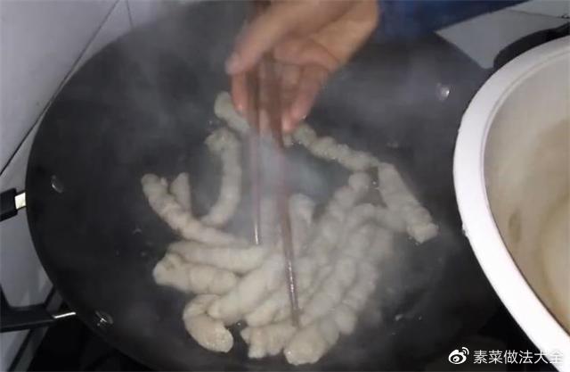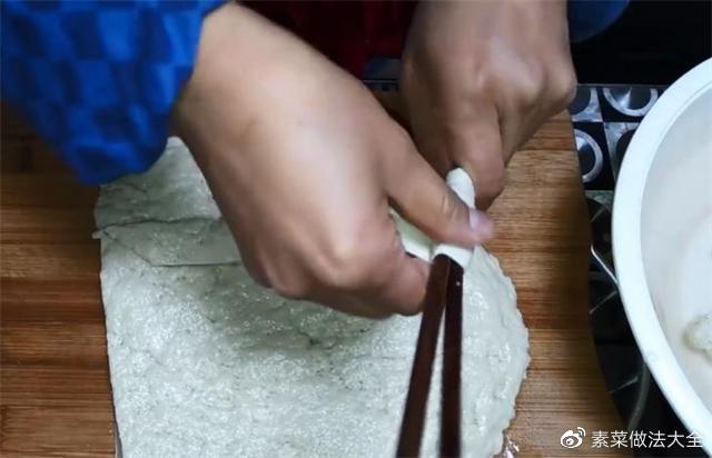 4.把面筋的一端夹在筷子中间,绕着筷子缠绕面筋,直到缠完为止,然后抽出来。
