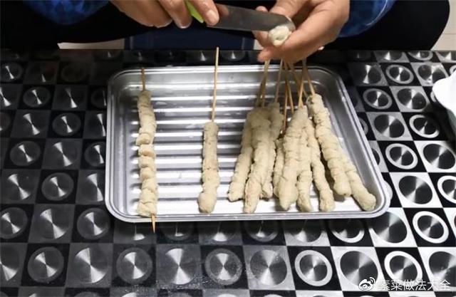 7.面筋串上竹签,然后用刀慢慢地围着面筋转一圈。