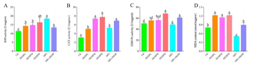图1|MPs、DEHP及MPs-DEHP对南美白对虾抗氧化防御机制的影响