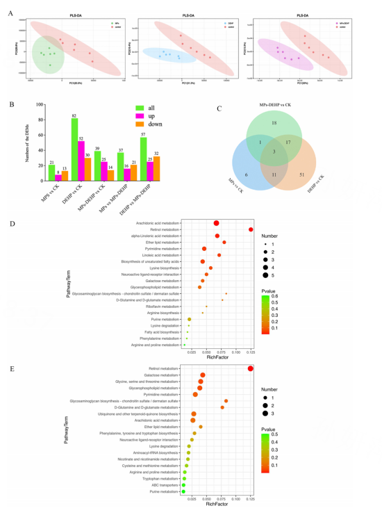 为了进一步探索MPs、DEHP和MPs - DEHP对南美白对虾组织的生理和代谢反应的毒理学效应,研究团队采用UHPLC-MS /MS进行了代谢谱分析,共鉴定出1,261种代谢物。具体说明,与CK相比,21个(8个上调和13个下调)、82个(52个上调和30个下调)和39个(25个上调和14个下调)的差异代谢物可区分MPs、DEHPM和MPs-DEHP。同时,KEGG通路富集分析表明,MPs、DEHPM和MPs-DEHP中的差异代谢物参与不同的代谢通路:MPs显著干扰嘧啶代谢,DEHPH显著改变花生四烯酸代谢、视黄醇代谢、α -亚麻酸代谢等(图3D)。此外,MPs-DEHP显著影响视黄醇代谢、半乳糖代谢以及甘氨酸、丝氨酸和苏氨酸代谢(图3E)。