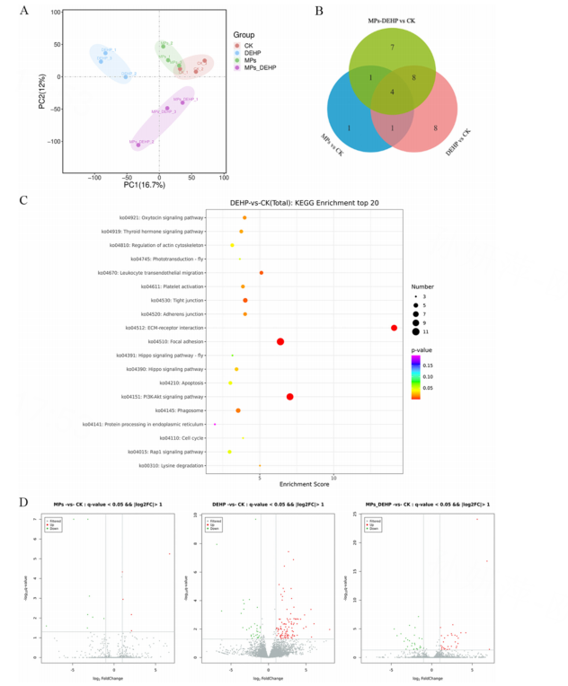 图2|南美白对虾经MPs、DEHP和MPs-DEHP处理21d后的转录组学分析