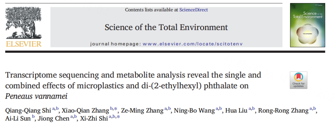 1月11日,宁波大学海洋学院-农产品质量安全危害因子与风险防控国家重点实验室在Sci Total Environ期刊(IF:10.753)上发表了题为“Transcriptome sequencing and metabolite analysis reveal the single and combined effects of microplastics and di-(2-ethylhexyl) phthalate on Peneaus vannamei”的研究论文。此项研究通过转录组及代谢组学联合分析为微塑料和塑料添加剂对海洋生物的单一和联合毒理学效应提供了新的见解!