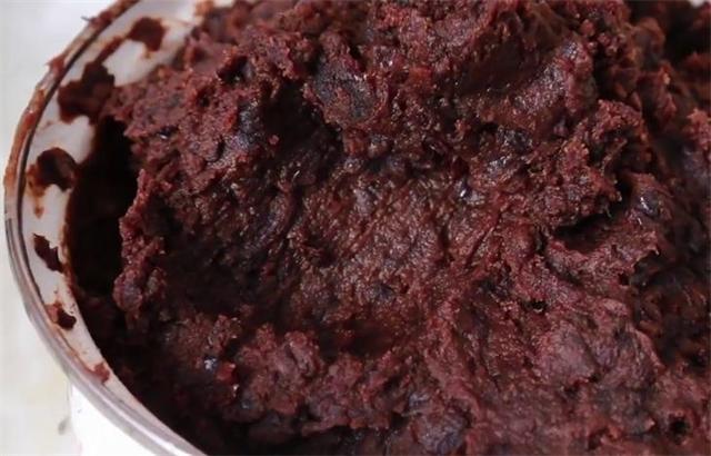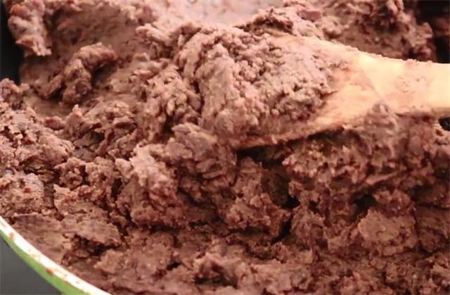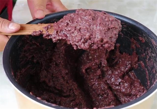 3.现在可以了,红豆煮熟后用铲子压成泥状,也可以用搅拌机,压到这种程度就差不多了。