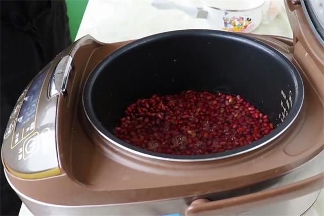 2.然后倒入电饭锅里,里面再加入水进去,水的量刚好淹没红豆即可,把红豆煮熟煮软,我用的是电饭煲,按一下煮饭键,煮好后再焖一个小时左右再揭开盖子。