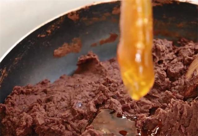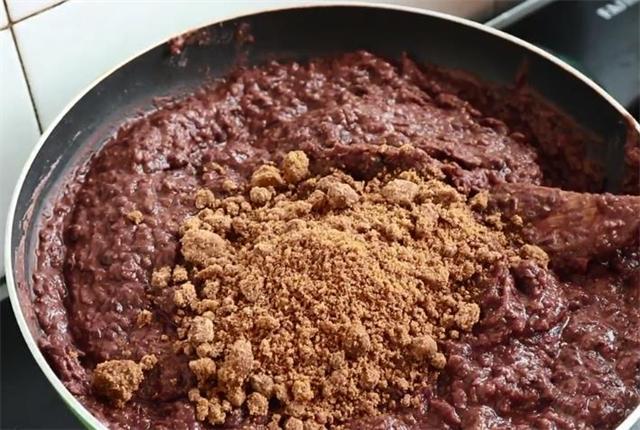 4.现在炒红豆馅,把红豆馅倒进不粘锅里面,这里注意一直用小火翻炒,翻炒大约5分钟左右,根据自己的口味往里面加入适量的红糖,翻炒到红糖和豆沙馅完全融合在一起,可以尝下甜度,不够甜的话可以适当地加入白糖。