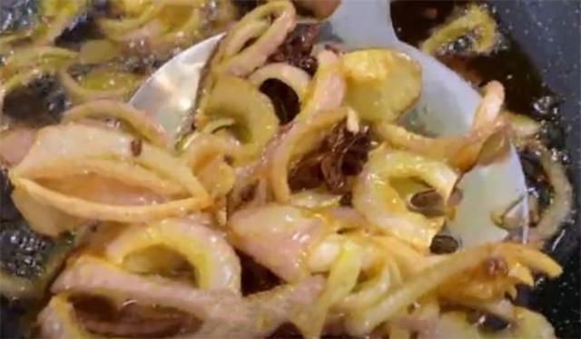 9.接下来我们来炼油,最好选择菜籽油,因为菜籽油的烟点比较高,适合煎和炸,其他的油在长期高温的情况下容易产生致癌物质,油温至五成热的时候把香料放进去炸,开小火慢慢的炸,一边炸要一边的搅拌,尽量把它炸的干一点,炸至所有的香料变得微微焦黄就可以了,然后把香料捞出来。