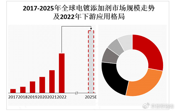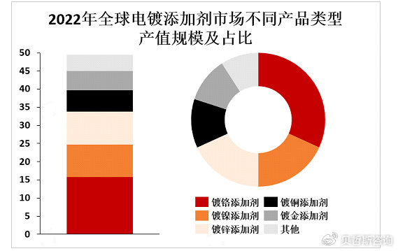 电镀添加剂是一种用于电镀过程中的化学物质,用于改善电镀液的性能和提高电镀质量。它们通常以液体或粉末的形式存在,并在电镀过程中被添加到电镀液中。电镀添加剂主要功能包括以下几个方面:促进金属离子的还原:电镀添加剂可以提供还原剂,促进金属离子在电极上的还原反应,使其沉积在基材表面形成金属镀层。控制电镀速度:电镀添加剂可以调节电镀液中金属离子的还原速率,从而控制电镀速度,使得金属镀层的厚度均匀且符合要求。改善镀层质量:电镀添加剂可以改善金属镀层的外观和性能,如提高光泽度、增强附着力、提高耐腐蚀性等。抑制杂质沉积:电镀添加剂可以抑制电镀液中的杂质沉积,减少镀层中的缺陷和污染。调节电镀液的酸碱度:电镀添加剂可以调节电镀液的酸碱度,使其保持在适宜的范围内,以确保电镀过程的稳定性和镀层质量。总之,电镀添加剂在电镀工艺中起着重要的作用,能够提高电镀质量、增加生产效率,并满足不同材料和工艺要求。电镀添加剂市场主要产品类型介绍镀铬添加剂:用于镀铬工艺,可以提高镀层的亮度、硬度和耐腐蚀性能。镀镍添加剂:用于镀镍工艺,可以提高镀层的光泽度、平整度和耐腐蚀性能。镀锌添加剂:用于镀锌工艺,可以提高镀层的附着力、耐腐蚀性和耐磨性。镀铜添加剂:用于镀铜工艺,可以提高镀层的导电性、耐腐蚀性和焊接性能。镀金添加剂:用于镀金工艺,可以提高镀层的亮度、耐磨性和耐腐蚀性。