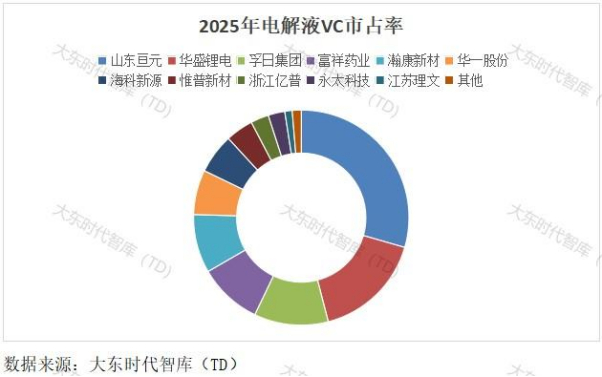 根据广东省电池行业协会产业研究中心调研数据显示,2025年1-10月,电解液VC市场占有率排名第一的企业为山东亘元市,占率达到29.47%;排名第二的企业为华盛锂电,市占率达到16.49%;排名三至七的企业分别为孚日集团、富祥药业、瀚康新材、华一股份、海科新源。