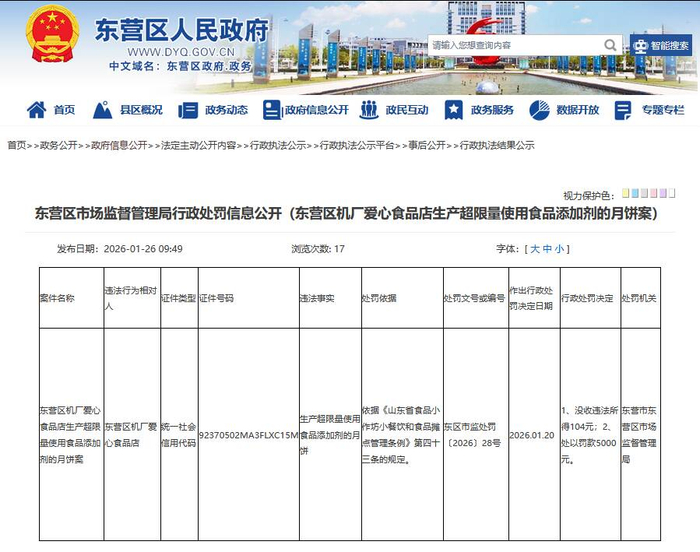 根据东营区人民政府官网公开的执法结果,东营区机厂爱心食品店(统一社会信用代码:92370502MA3FLXC15M)存在生产超限量使用食品添加剂月饼的违法事实。依据《山东省食品小作坊小餐饮和食品摊点管理条例》第四十三条的规定,东营区市场监督管理局于 2026年1月20日作出行政处罚决定(处罚文号:东区市监处罚〔2026〕28 号),对该食品店处以 “没收违法所得104元、罚款5000 元”的行政处罚。