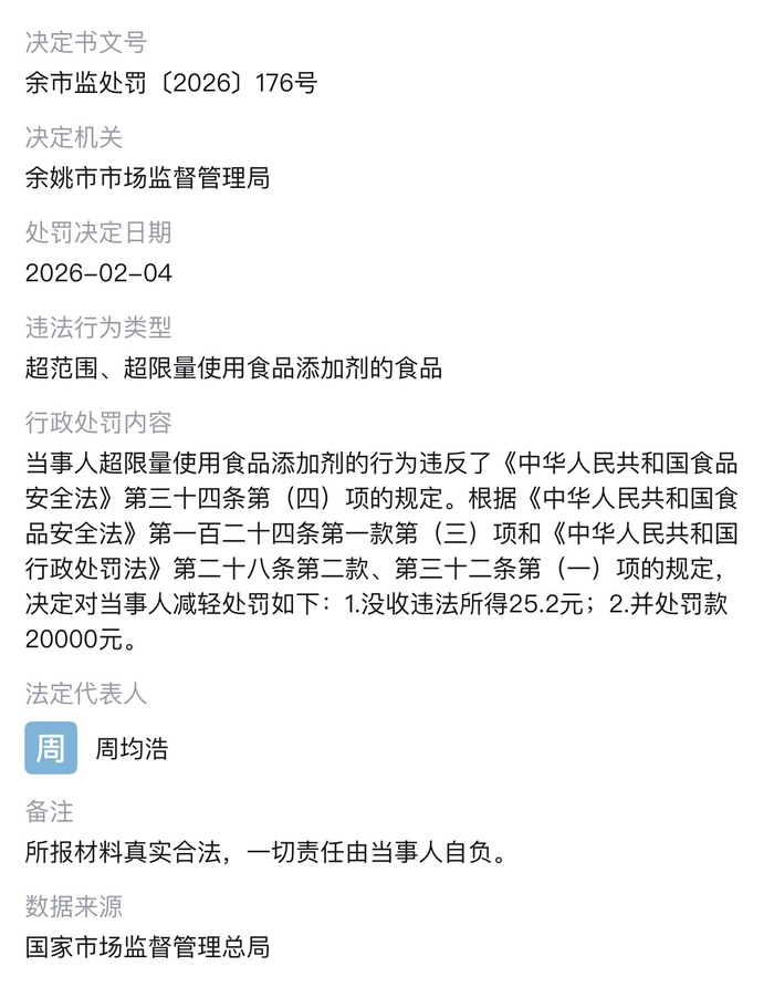 #宁波余姚一菜厂添加剂超标被罚2万# 2026年2月,余姚浩缘菜厂因生产的“君浩雪菜”苯甲酸及其钠盐超标、防腐剂混合使用比例违规,被没收违法所得25.2元并罚款2万元。这是该厂近十年第二次因食品安全问题被罚,2017年8月其就曾因违反食安管理规定受罚。网友热议认为该处罚力度过轻,违法成本低,呼吁加大食品安全处罚力度。(余姚生活)#2026家乡年##我在宁波过春节#